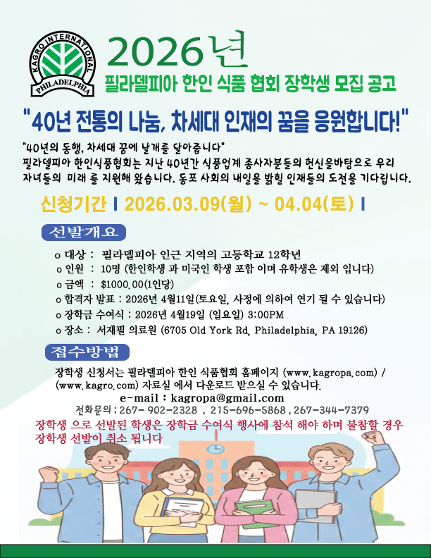 2026년 필라델피아 한인 식품 협회 장학생 모집 공고